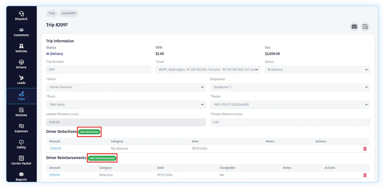 To add deductions or reimbursements for drivers, you need to open the corresponding trip record and in the "Driver Deductions" or "Driver Reimbursements" sections, you need to click on the "add deduction" or "add reimbursement" button, respectively.