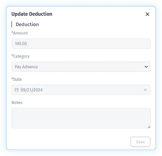 After you click on the "add deduction" button, a pop-up will appear. In the opened popup you should fill in the fields "Amount", "Category", and "Date". And if necessary, "Notes".