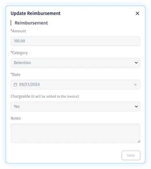 After you click on the "add reimbursement" button, a pop-up will appear. In the opened popup you should fill in the fields "Amount", "Category", and "Date". And if necessary, "Chargeable", and "Notes". If you set the "Chargeable" field to "Yes", it means that this amount will be paid by the customer/broker and will be displayed on the corresponding invoice.