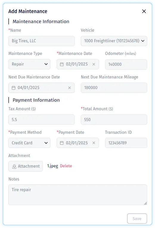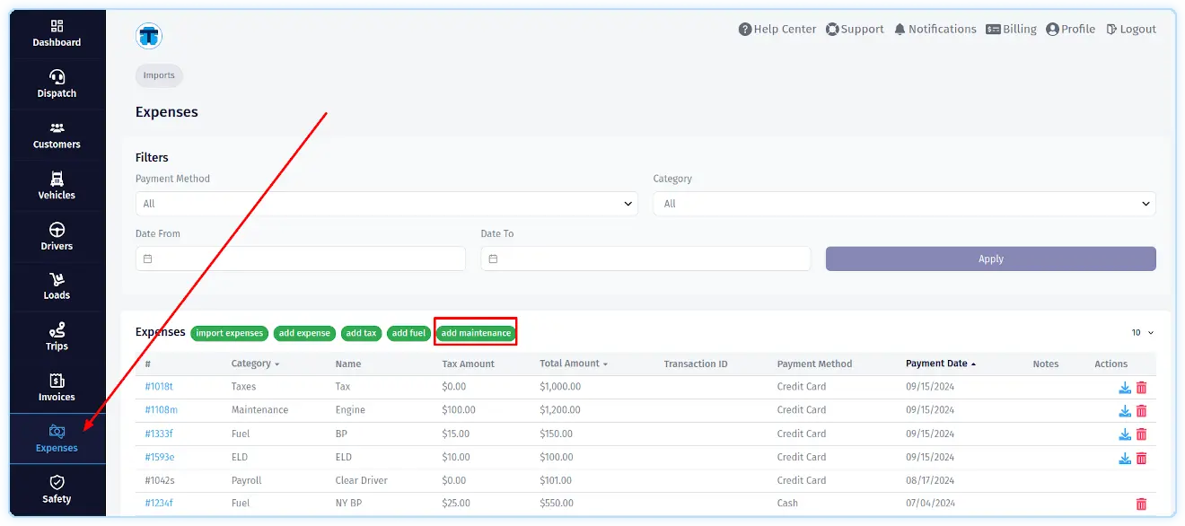 Maintenance tracking is an integral part of a successful trucking business. In the TMS you can easily track maintenance records.