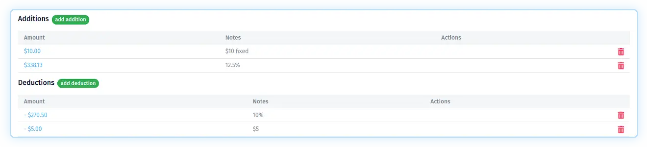 To add invoice additions and deductions, you need to open the page of the corresponding invoice and in the "Additions", "Deductions" sections, click on the "add addition" or "add deduction" button. A popup will open where you will need to fill in the "Amount" and "Notes" fields.