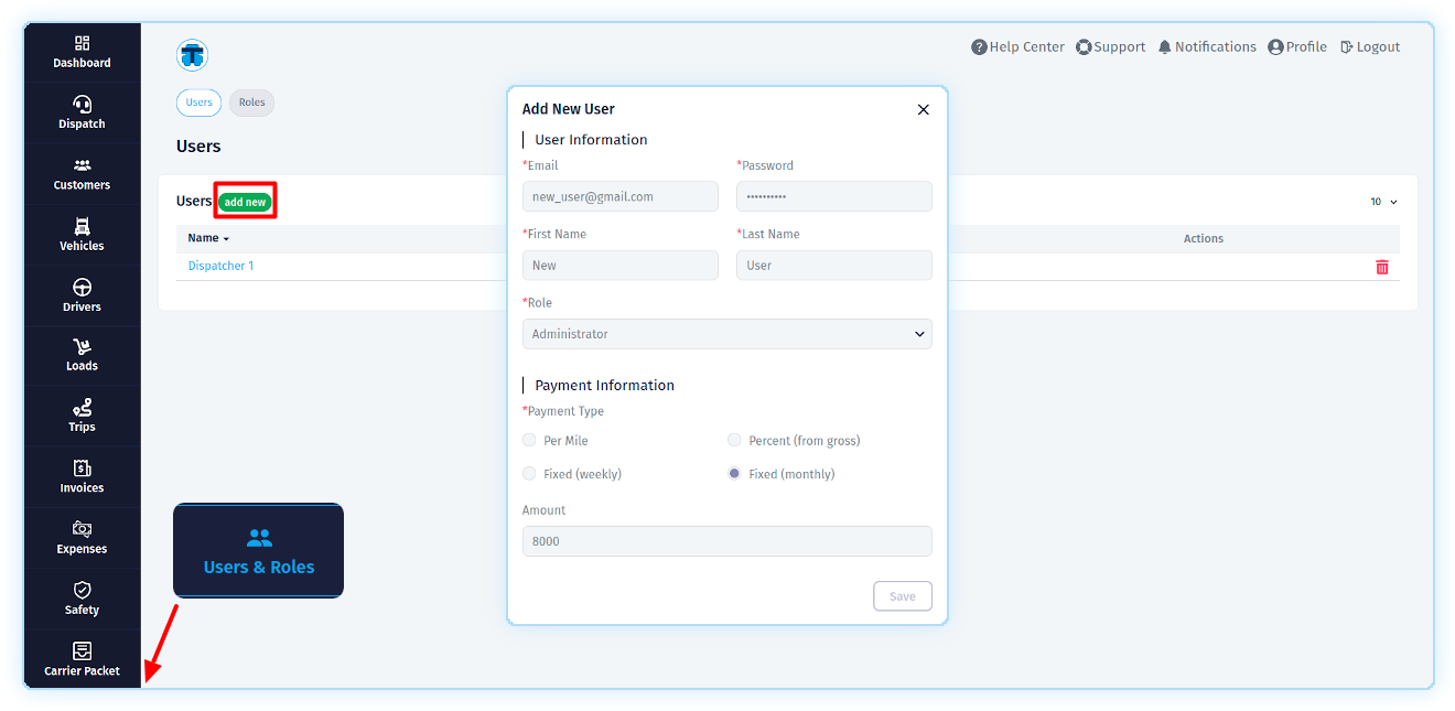 A popup will appear with a form where you will need to fill in certain fields. Fields marked with an asterisk are required. In the opened popup you should fill in the fields "Email", "Password", "First Name", "Last Name", "Role" and "Payment Type". And if necessary, "Amount". The value in the "Role" field will determine what role this user will belong to, and therefore what permissions he will have.