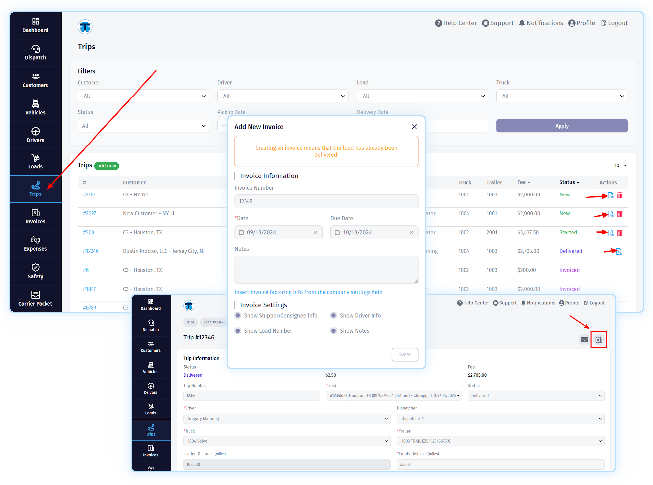 1. By clicking the "Create Invoice" button directly on the trip record page.
