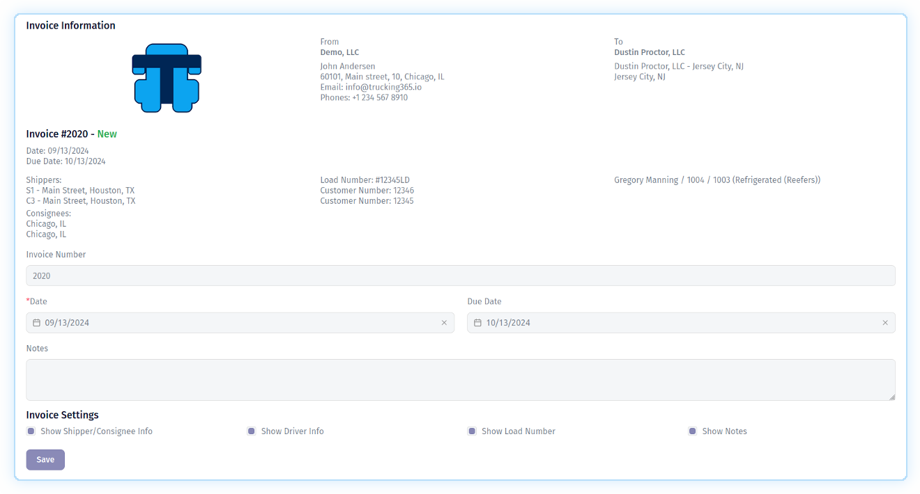 The "Invoice Information" section contains information about the company that issues the invoice, information about the company to which the invoice is addressed, information about the load, and the trip for which the invoice is issued. If you added your company logo on your profile page, the invoice will contain it. In addition, this section contains all the fields of the form that you filled out when creating this invoice. You can change the values of these fields.