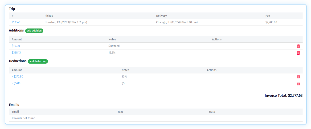 The invoice page consists of several sections: "Invoice Information", "Invoice Settings", "Trip", "Additions", "Deductions", "Emails".