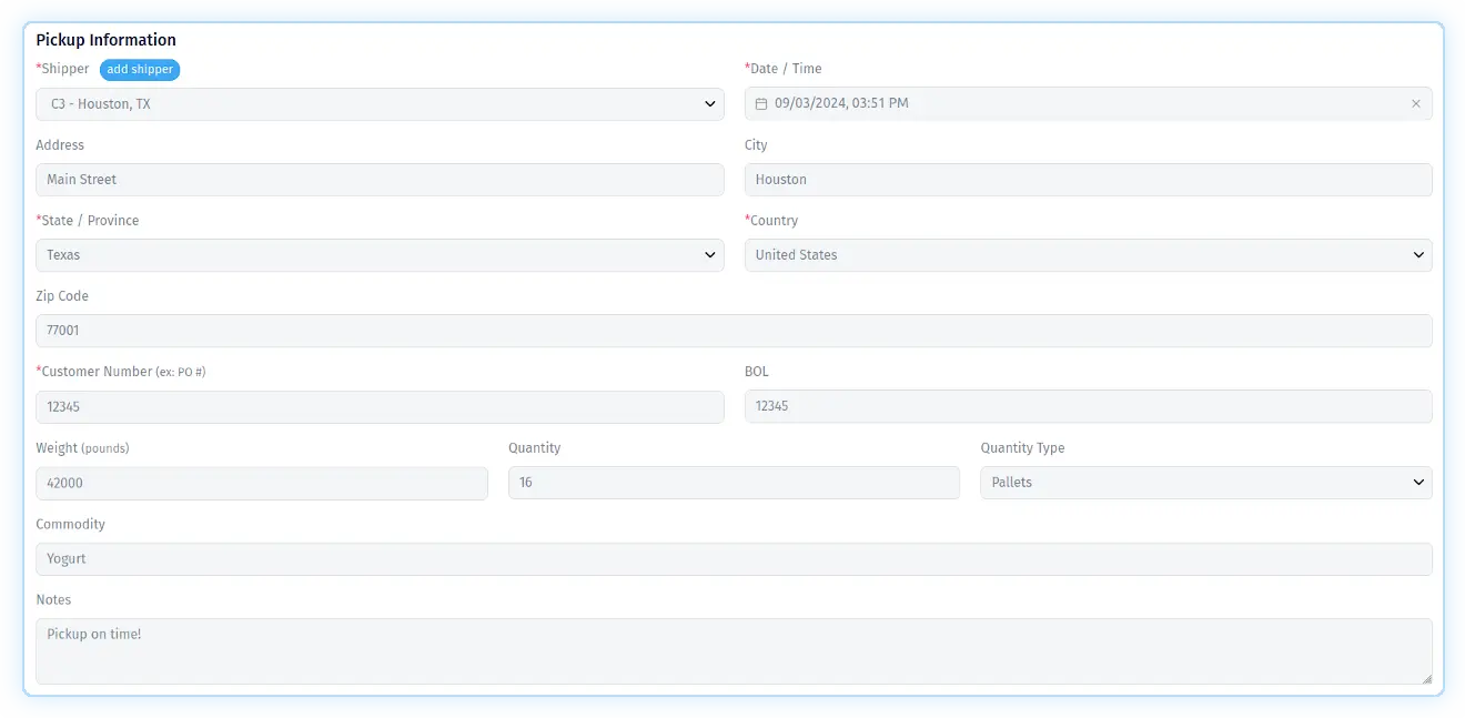 When you first create a load record, there is a "Pickup Information" section, where you fill the first pickup point information. You have to fill in pickup related fields such as: "Shipper", "Date / Time", "State / Province", "Country", "Customer Number". If the current list of the "Shipper" field does not contain the corresponding company, you can create it "on the fly" (without going to the "Customers" page) by clicking on the "add shipper" button. You can also fill in the following fields: "Address", "City", "Zip Code", "BOL", "Weight", "Quantity", "Quantity Type", "Commodity", "Notes". To speed up filling in the form, you can start filling in the "Address" field, after which you will see a pop-up list with suggested options. If you click on one of them, the fields associated with the address will be filled in automatically.