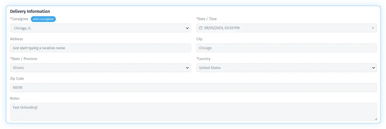 When you first create a load record, there is a "Delivery Information" section, where you fill the last delivery point information. You have to fill in delivery related fields such as: "Consignee", "Date / Time", "State / Province", "Country". If the current list of the "Consignee" field does not contain the corresponding company, you can create it "on the fly" (without going to the "Customers" page) by clicking on the "add consignee" button. You can also fill in the following fields: "Address", "City", "Zip Code", "Notes". To speed up filling in the form, you can start filling in the "Address" field, after which you will see a pop-up list with suggested options. If you click on one of them, the fields associated with the address will be filled in automatically.