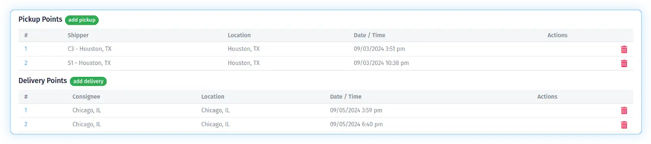 After the load has already been created, section "Pickup Points" replaces section "Pickup Information" and section "Delivery Points" replaces section "Delivery Information". Section "Pickup Points" will contain a table with all pickup points and section "Delivery Points" will contain a table with all delivery points.