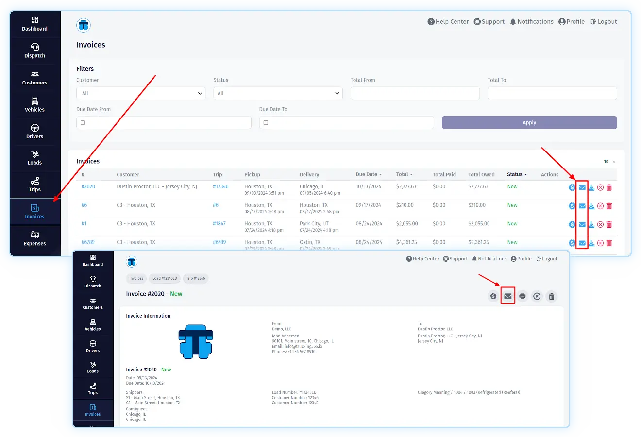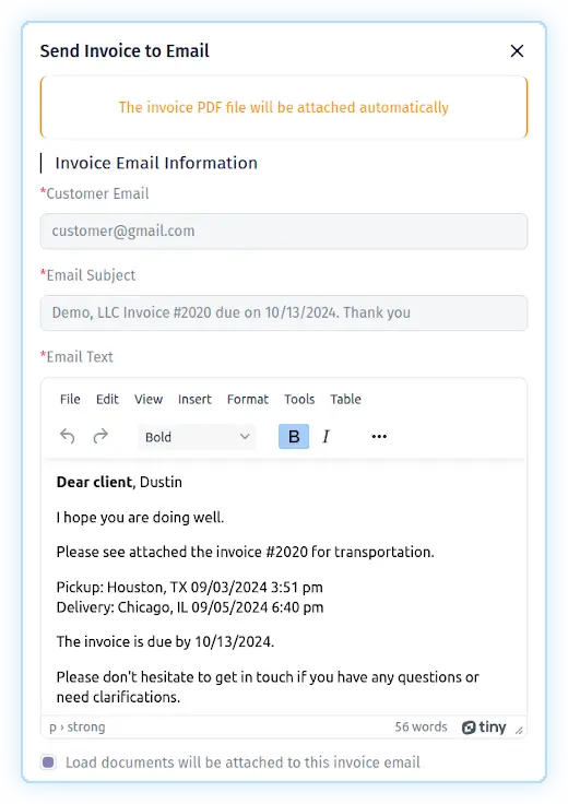 By default, the form is designed to send invoice to the customer (broker) assigned to this invoice. If the customer's profile contains a valid email address, the "Customer Email" field will be pre-filled with this value. The "Email Subject" field will also be pre-filled according to the system template (see how you can change an invoice email template). The "Email Text" field will be pre-filled with all the data related to this invoice. All these fields are editable. Therefore, you can change them at your discretion. If the "Load documents will be attached to this invoice email" checkbox is enabled (enabled by default), then the following load documents will be attached to the email as attachments: "Load confirmation", "BOL" (if they were specified in the corresponding load). Click on "Send" button.