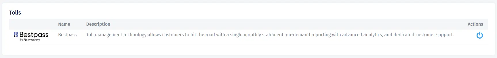 Go to the "Integrations" page in TMS and click on the "Connect to Bestpass" button in the "Tolls — Bestpass" section. In the opened pop-up, fill in the fields "Account ID", "Expense Name", and "Expense Payment Method". Fill in the "Account ID" field with your Bestpass Account ID. In the fields "Expense Name" and "Expense Payment Method," specify the name of the expense and the payment method that TMS will set when creating an expense record when importing tolls. In the field "Automatically assign" set the value "Yes" if you want the system to automatically assign a truck by unit or license plate number if the transponder ID was not previously set manually. In the field "Is toll deductible by default?" set the value "Yes" if you want the system to set "Is deductible" = true for automatically assigned trucks. Click the "Save" button.