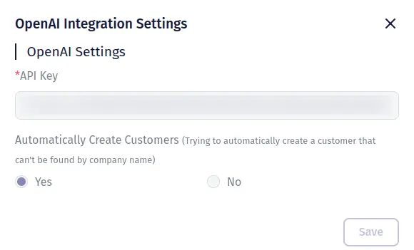 Go to the "Integrations" page in TMS and click on the "Connect to OpenAI" button in the "AI — OpenAI" section. In the opened pop-up, fill in the fields "API Key" and "Automatically Create Customers". Fill in the "API Key" with the created secret key in the OpenAI account. In the field "Automatically Create Customers" set the value "Yes" if you want the system try to automatically create a customer that can't be found by company name. Click the "Save" button.