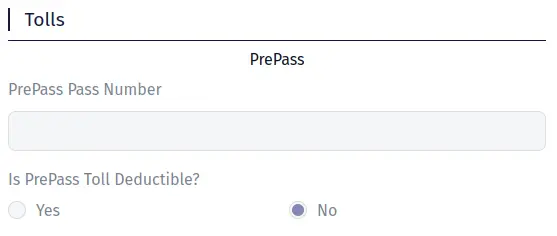 Go to the "Vehicles" page. Open the trucks for editing. In the pop-up that opens, scroll to the "Tolls" section. In the "PrePass Pass Number" field, specify the corresponding transponder ID for this truck. In the "Is PrePass Toll Deductible?" field, set the value to "Yes" if you want the TMS to find the driver associated with this truck and automatically create a deduction for the amount of this expense.