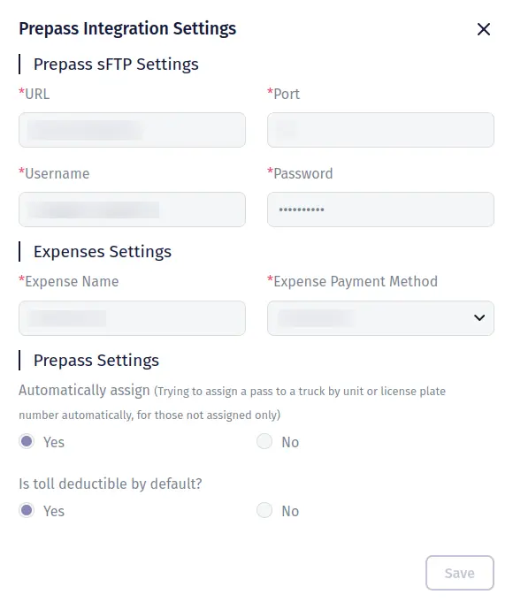 Go to the "Integrations" page in TMS and click on the "Connect to PrePass" button in the "Tolls — PrePass" section. In the opened pop-up, fill in the fields "URL", "Port", "Username", "Password", "Expense Name", and "Expense Payment Method". Fill in the "URL", "Port", "Username", "Password" fields with sFTP credentials provided by PrePass. In the fields "Expense Name" and "Expense Payment Method," specify the name of the expense and the payment method that TMS will set when creating an expense record when importing tolls. In the field "Automatically assign" set the value "Yes" if you want the system to automatically assign a truck by unit or license plate number if the transponder ID was not previously set manually. In the field "Is toll deductible by default?" set the value "Yes" if you want the system to set "Is deductible" = true for automatically assigned trucks. Click the "Save" button.