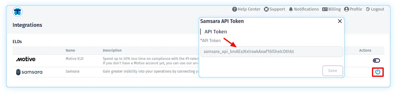 Go to the "Integrations" page in TMS and click on the "Connect to Samsara" button in the "ELDs—Samsara" section. Copy your API key from your Samsara account and paste it into the "API Token" field of the "Samsara API Token" TMS pop-up that opens. Click the "Save" button.