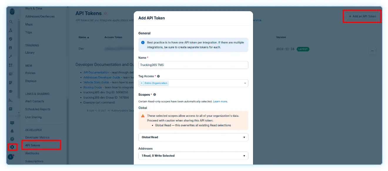 1. In your Samsara account, go to the "Settings" page, then find "API Tokens" and click "Add an API Token".