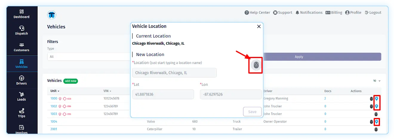 To retrieve a truck o a trailer's current location from Samsara, open the "Vehicles" page in TMS, select the desired truck or trailer, and click on the location icon (Current Location) in its line. In the pop-up that opens, click on the button with the Samsara icon (Get Location from Samsara).