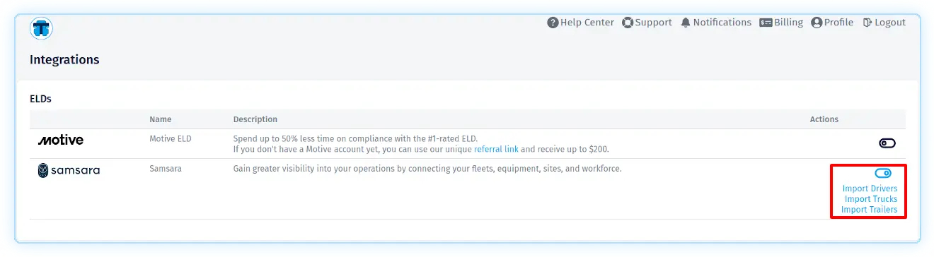 Import data from Samsara ELD to Trucking365 TMS