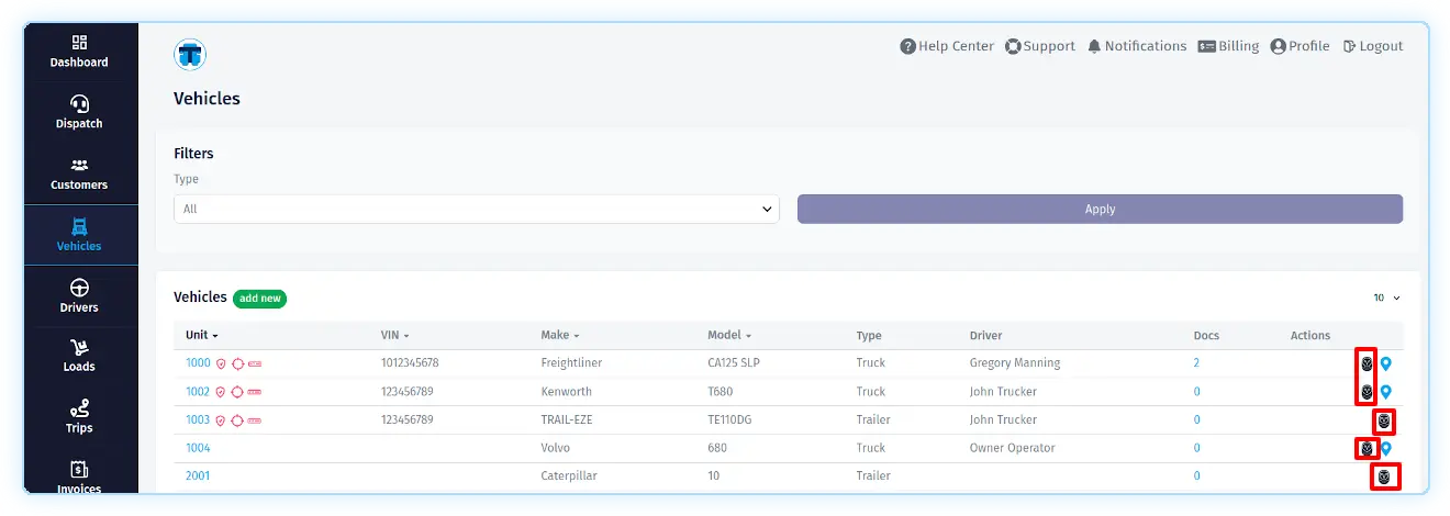 During the import process, TMS checks whether the data for this truck has been imported before. If so, the system will update "Unit", "VIN", "Make", "Model", "Year", "License Plate Number" in TMS if they are filled in Samsara. If not, the system will try to find the truck in TMS by "Unit" or "VIN" from Samsara. Then it will establish a connection between the TMS truck and the corresponding truck in Samsara and update "Unit", "VIN", "Make", "Model", "Year", "License Plate Number" in TMS if they are filled in Samsara.