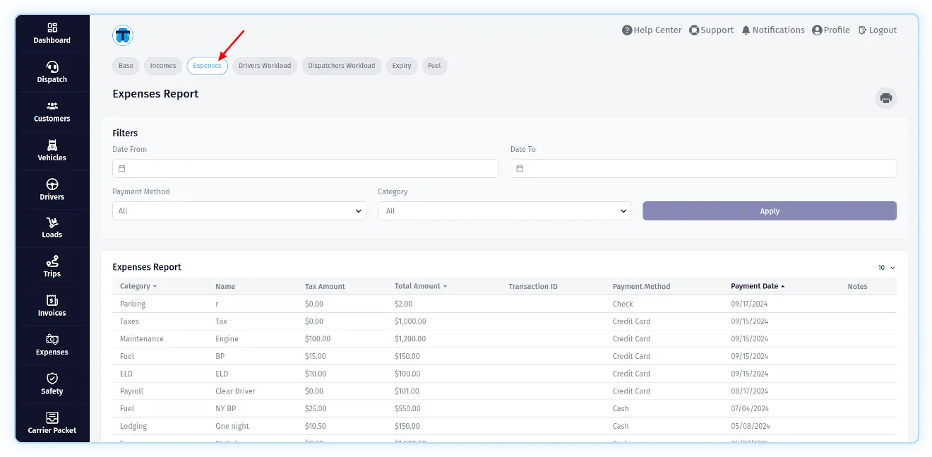 To open expenses report, click on the "Reports" link in the main menu, located in the left sidebar, and then click on the "Expenses" button in the top link bar.