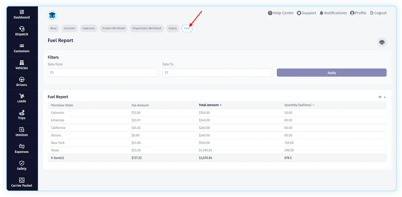 To open fuel report, click on the "Reports" link in the main menu, located in the left sidebar, and then click on the "Fuel" button in the top link bar.