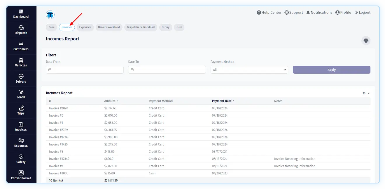 To open incomes report, click on the "Reports" link in the main menu, located in the left sidebar, and then click on the "Incomes" button in the top link bar.