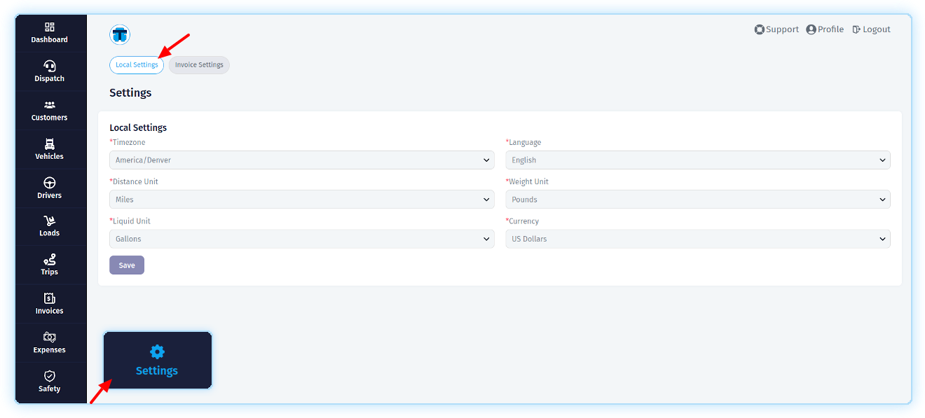 On the settings page, you can set such fields: "Timezone", "Language", "Distance Unit", "Weight Unit", "Liquid Unit", "Currency"