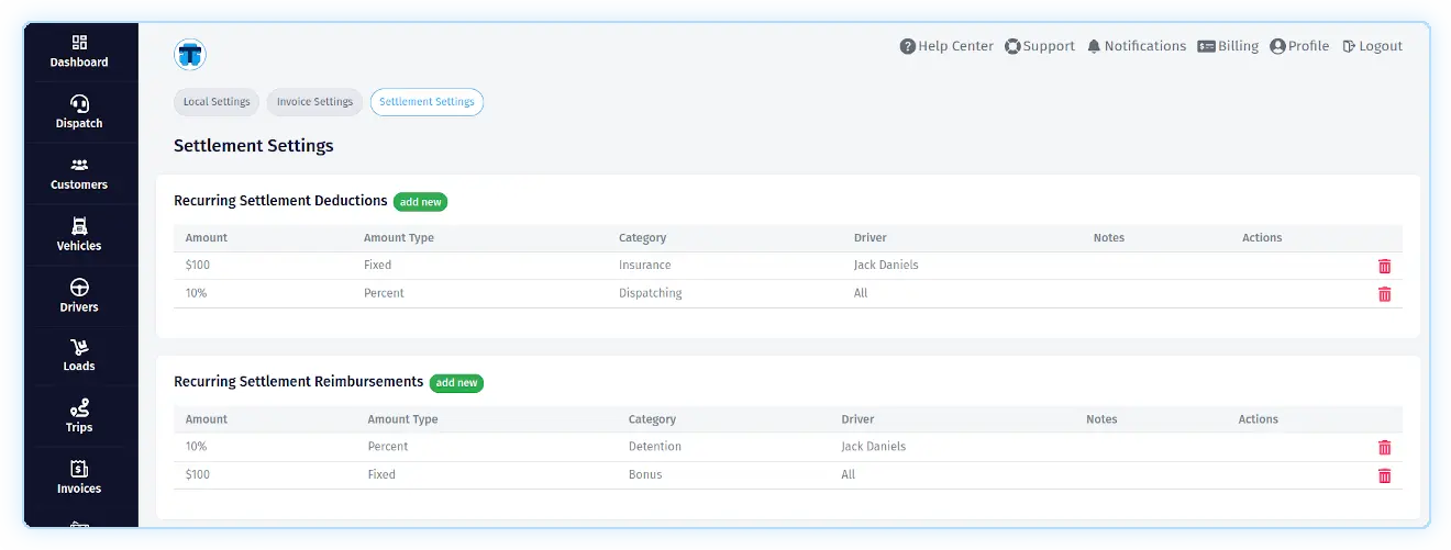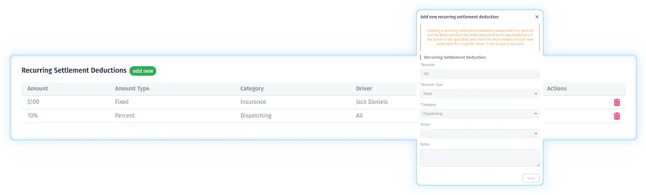 In the "Recurring Settlement Deductions" section, you can create and delete records that will be automatically created within each newly created settlement if the driver is not specified, and each new settlement for a specific driver if the driver is selected.